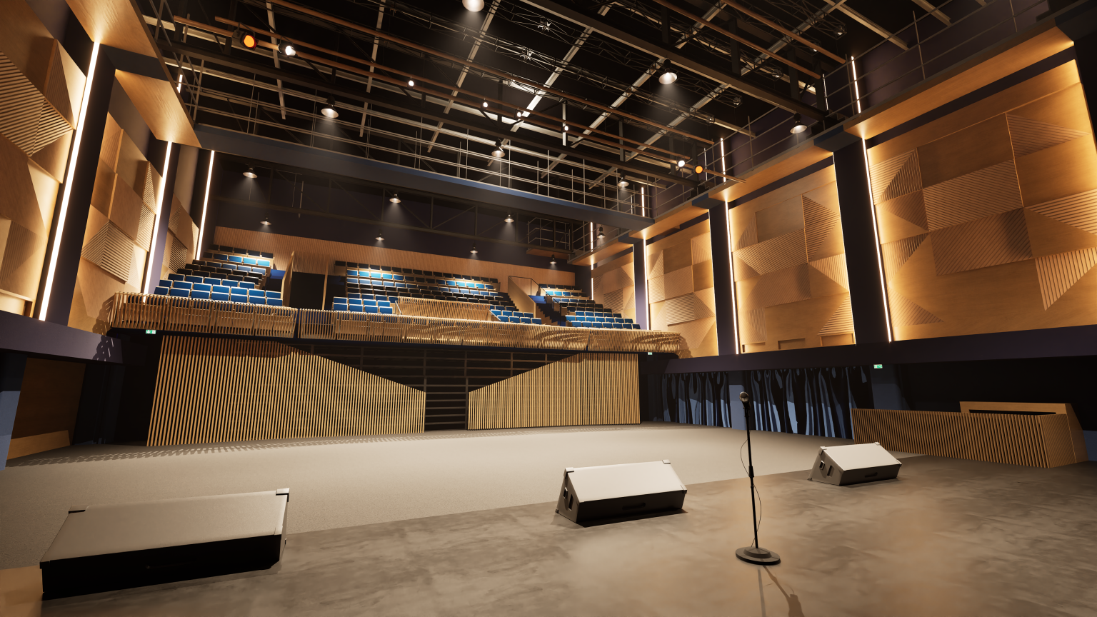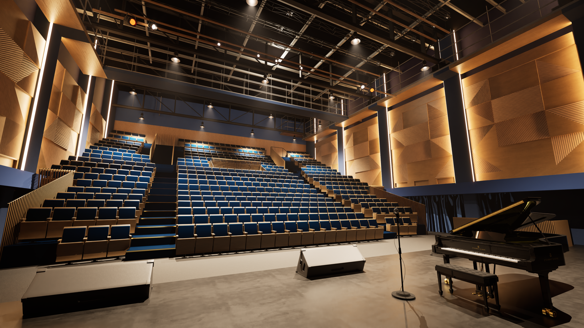 - La transformation de la salle de spectacles par la réhausse du plancher et le décaissement du sous-sol, permettant la création d’une salle de répétition de 150 m² aux dimensions identiques à la scène principale, pouvant accueillir jusqu’à 50 personnes